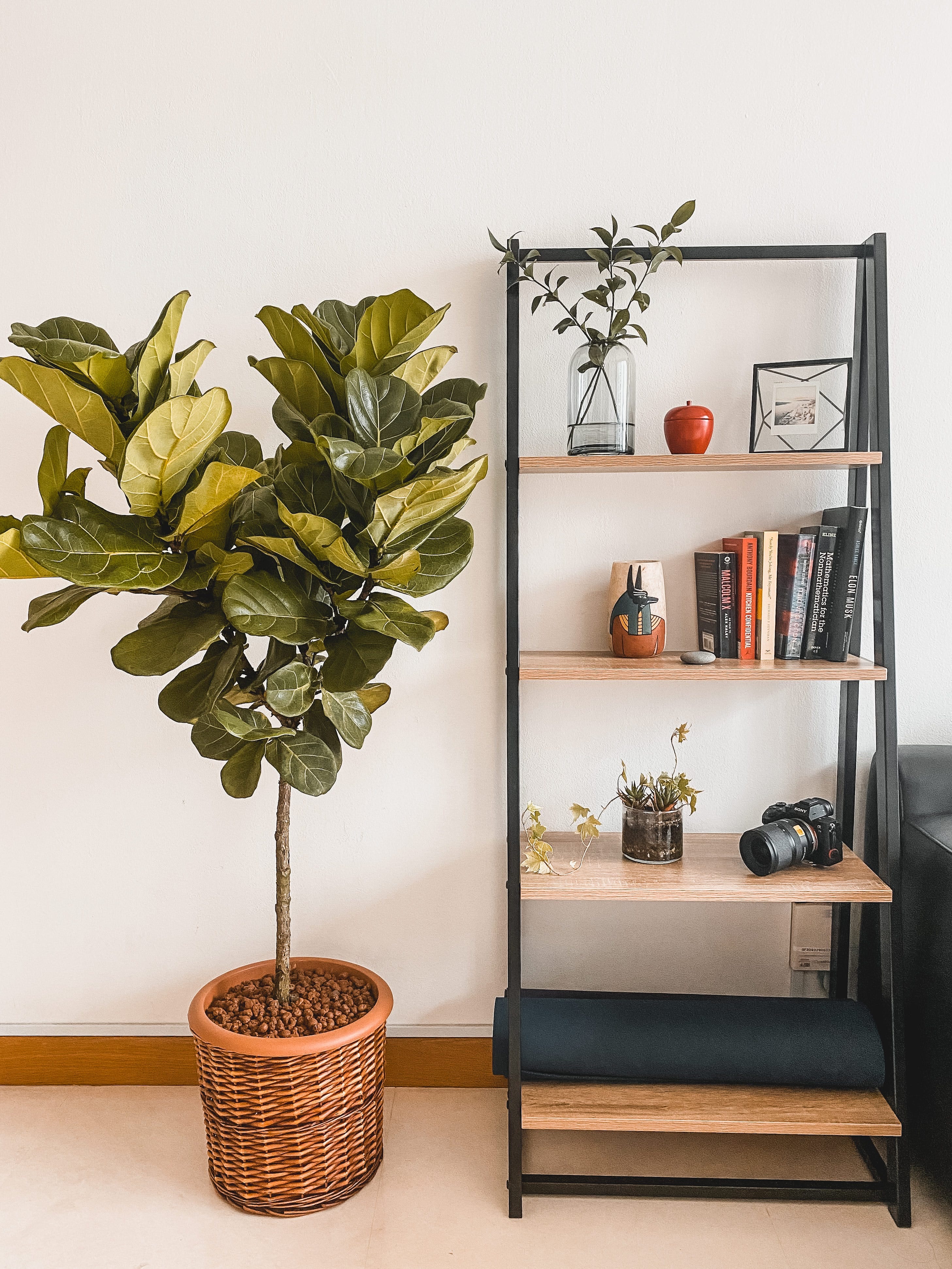 Tôi làm một góc kệ nhỏ kế bên ghế sofa để sách, và cây - tạo không khí xanh trong nhà. Từ ngày có góc này, tôi cũng chăm ra phòng khách đọc sách hơn, thay vì cứ ru rú trong phòng làm việc.