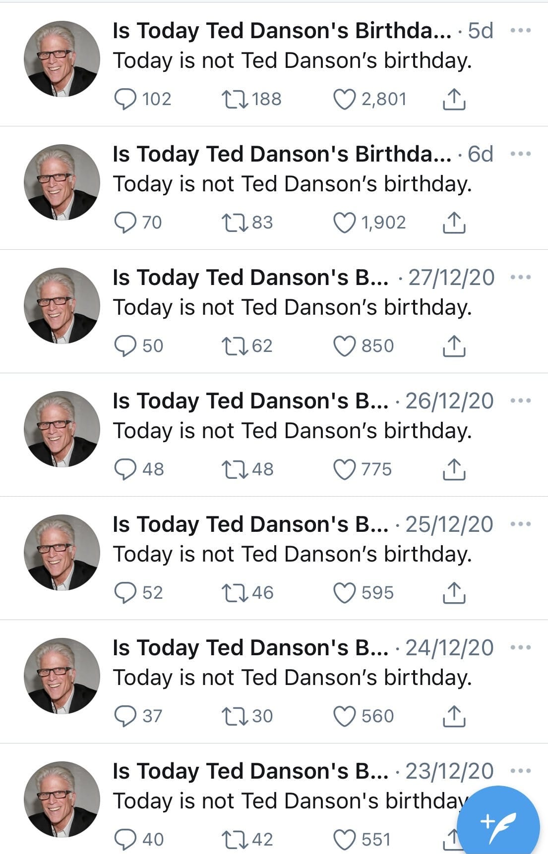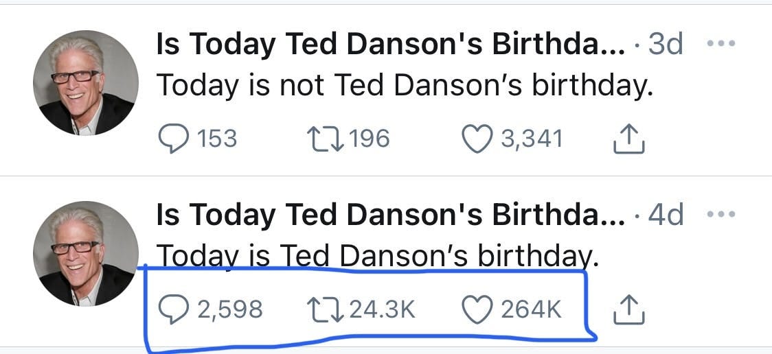 Twitter — Is Today Ted Danson’s Birthday? (Hôm nay có phải là sinh nhật của Ted Danson không?). Tôi thật sự không biết Ted Danson là ai nhưng phải chết cười với cái twitter này. Mỗi ngày, tài khoản này đăng đúng một dòng tweet là hôm nay có phải là ngày sinh nhật của Ted Danson không. Nó trông như thế này: 🤣